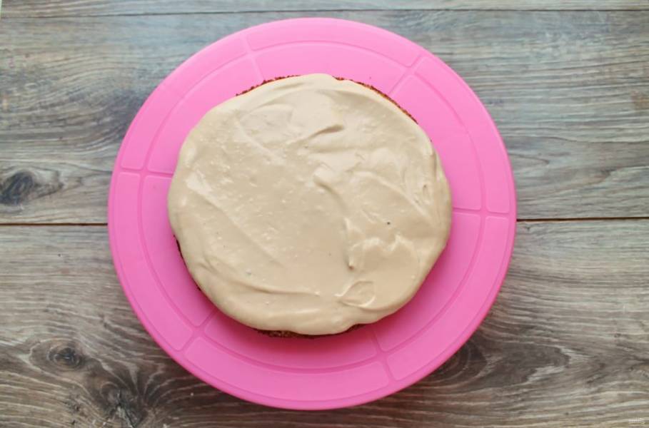 Для крема взбейте сливки до плотных пиков, добавьте вареную сгущенку и взбейте снова до однородного крема. Уберите в холодильник на два часа для стабилизации.