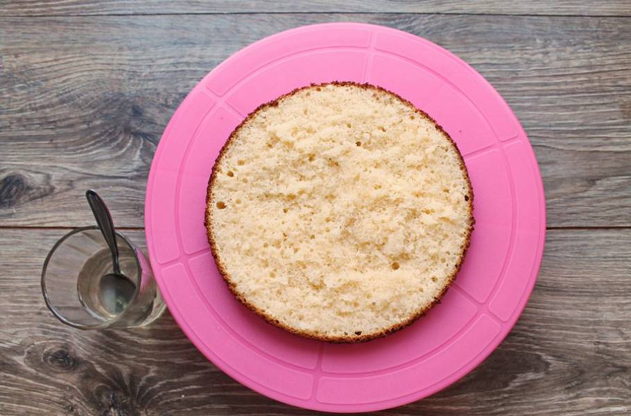 Бисквит разрежьте на две части, каждый пропитайте сиропом от консервированных фруктов.