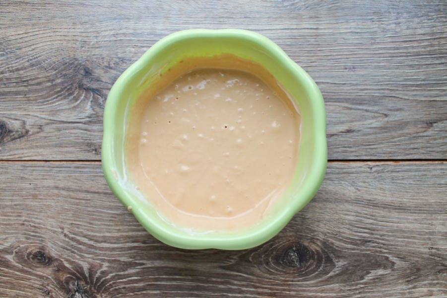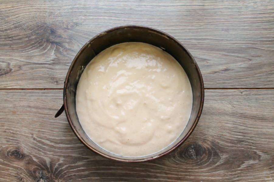 Разъемную форму диаметром 18 сантиметров смажьте растительным маслом и посыпьте мукой. Переложите в нее тесто.