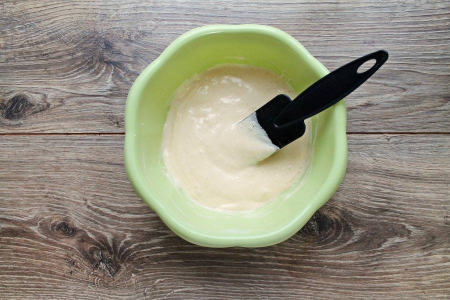 Во взбитые яйца просейте муку и аккуратно перемешайте сверху вниз до однородного и пышного теста.