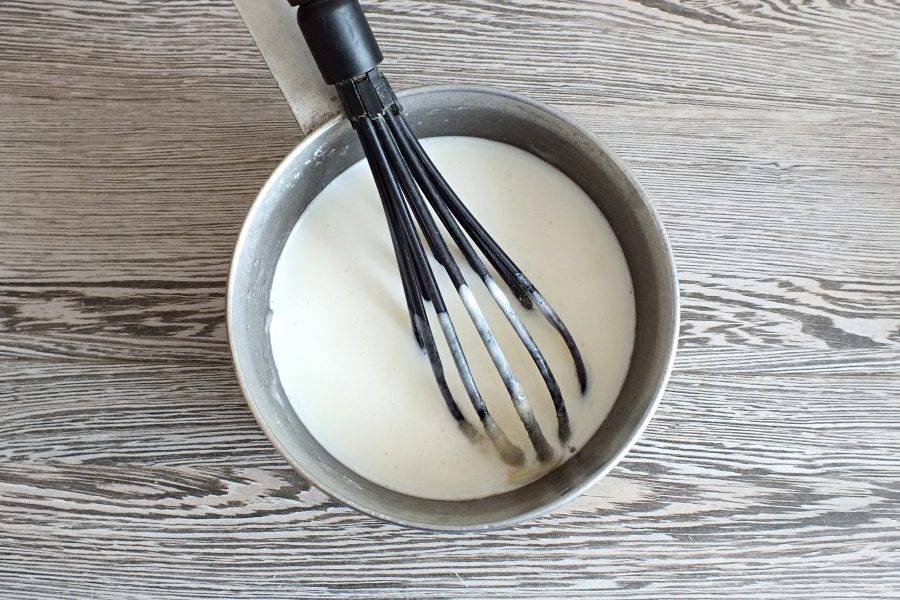 Влейте теплое молоко. Размешайте до исчезновения комочков. После поставьте на средний огонь. Варите, постоянно помешивая. Как только крем начнет "булькать", снимите с огня.