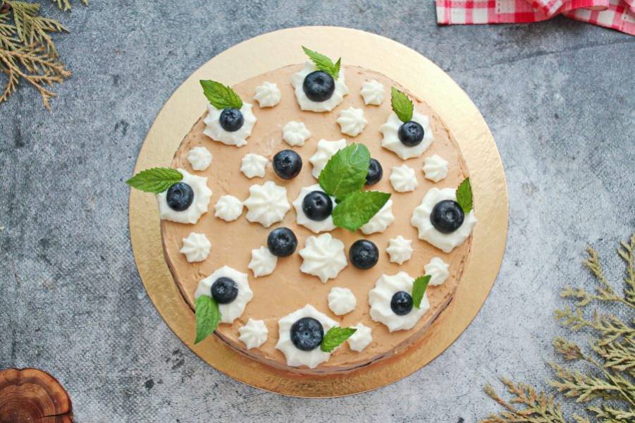 Смажьте один корж ровным слоем частью крема и разложите голубику, оставив для украшения.