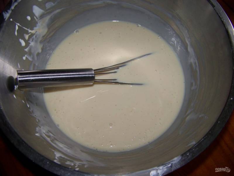 В отдельной емкости венчиком взбейте сметану и сгущенку до однородности. Введите разведенный желатин.