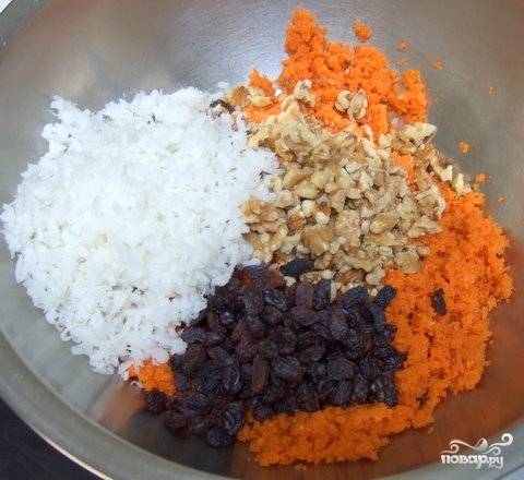 5.Орехи немного измельчить, а изюм замочить в горячей воде минут на 5. 6.Смешать кокосовую стружку, морковь, изюм и орехи.