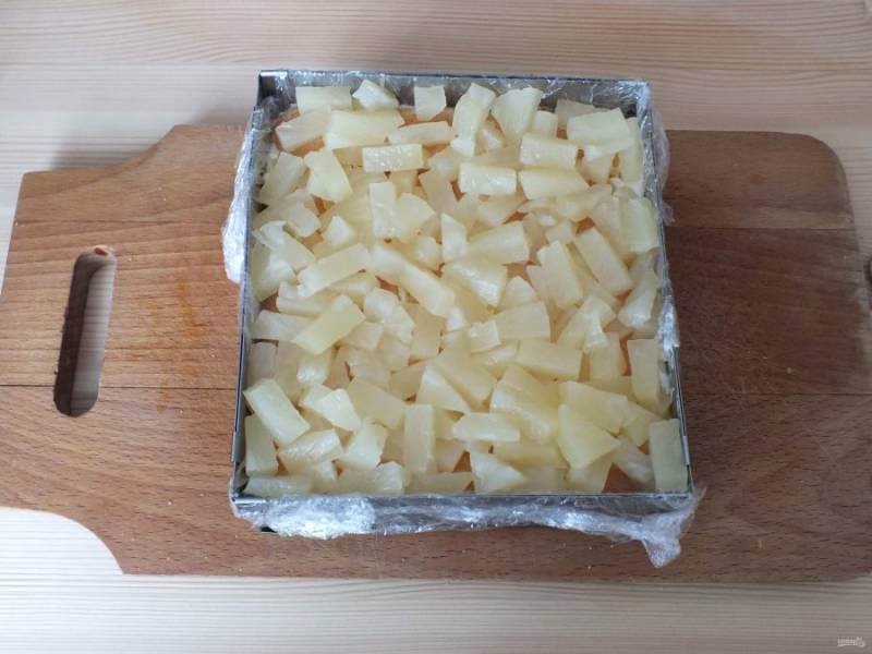 Возьмите разъемную форму, выложите ее пищевой пленкой и уложите первый слой из печенья. Смочите слегка соком от консервированных ананасов.