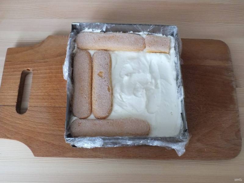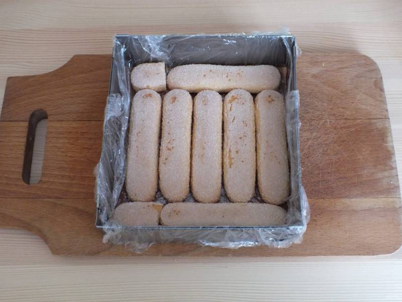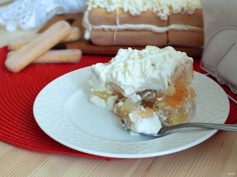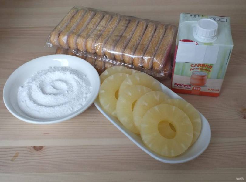 На ананасы уложите слой печенья савоярди, слегка пропитайте соком ананаса.