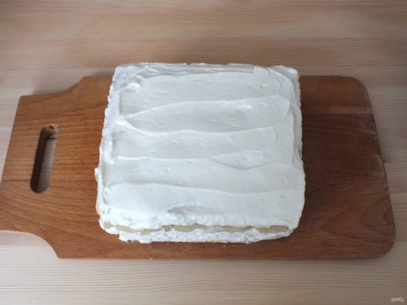 Снимите форму, уберите пленку и обмажьте обильно кремом со всех сторон.