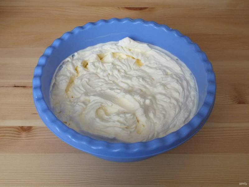 В чашу налейте охлажденные сливки, слегка взбейте, добавьте сахарную пудру и взбейте в пышный крем. После уберите в холодильник.