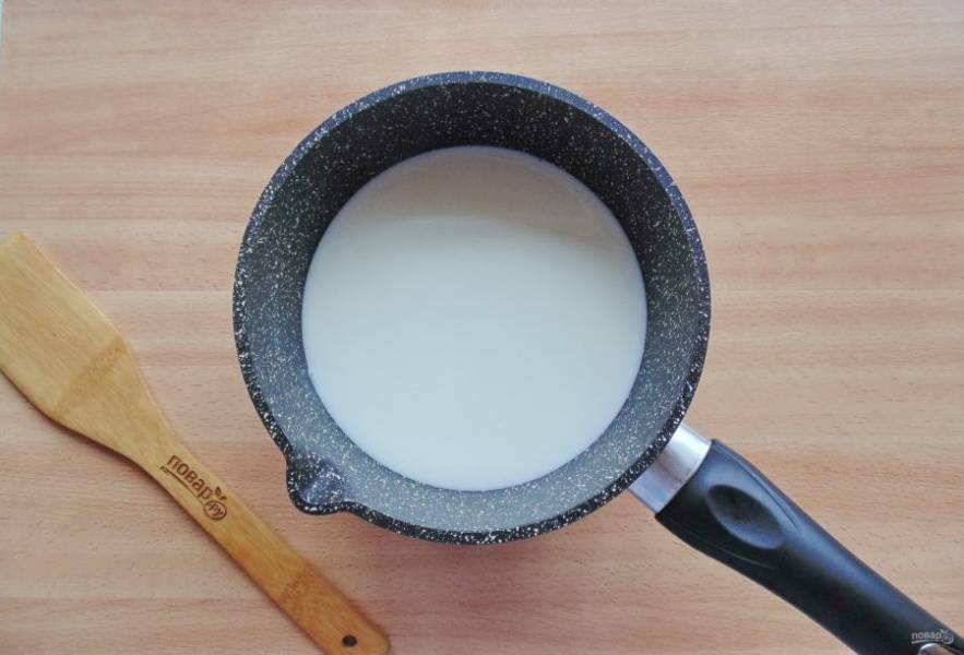 Пока профитроли в духовке, приготовьте заварной крем. В кастрюлю налейте молоко и поставьте на плиту.