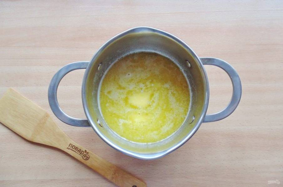 Приготовьте тесто для профитролей. В кастрюлю с толстым дном выложите сливочное масло, налейте воду.