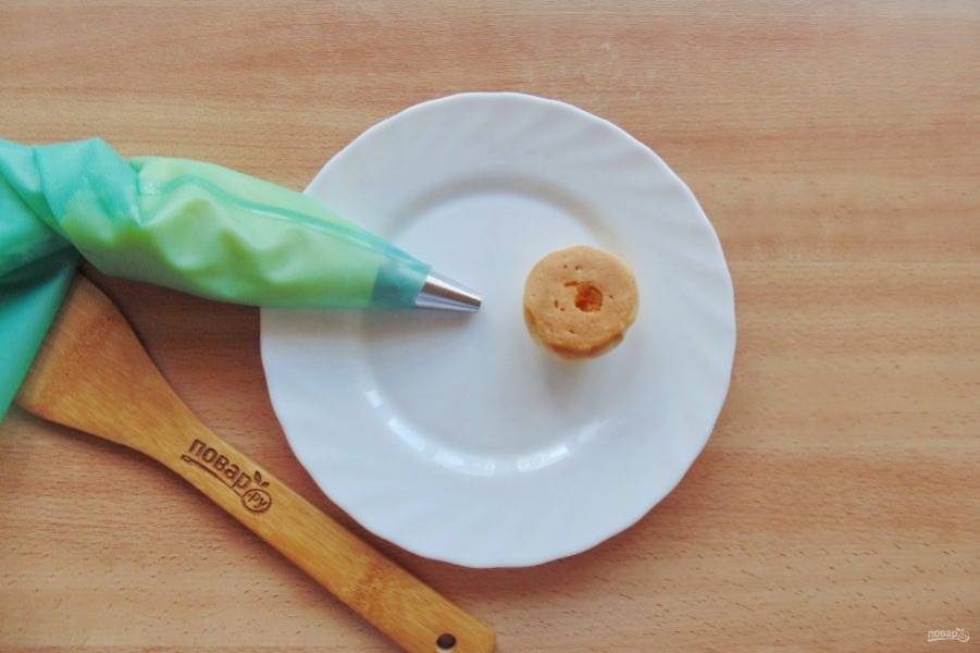 Выложите заварной крем в кулинарный мешок с насадкой или кулинарный шприц. Сделайте отверстие в профитролях и наполните их кремом.
