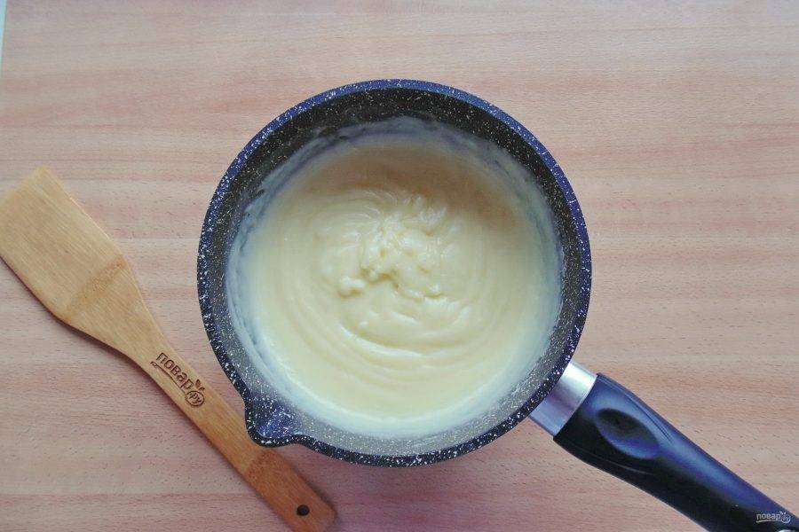 Когда молоко начнет закипать, влейте приготовленную смесь. Постоянно перемешивайте крем до загустения. После охладите его.