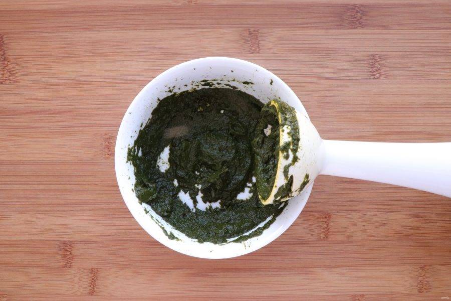 Шпинат отварите на пару до готовности, обдайте ледяной водой и отожмите. Измельчите при помощи блендера.
