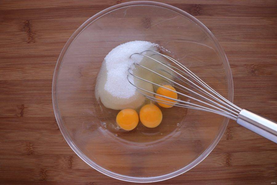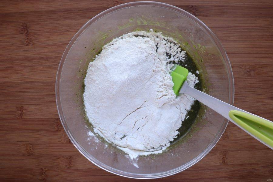 Добавьте просеянную муку с разрыхлителем и щепотку соли. Перемешайте.