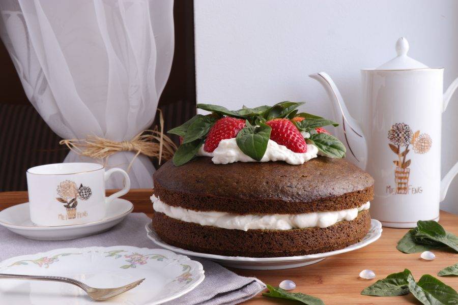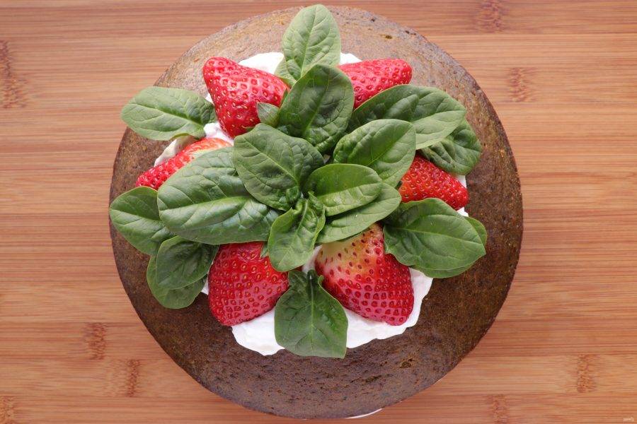 Верхний корж украсьте остатками крема, ягодами и молодыми листиками шпината.