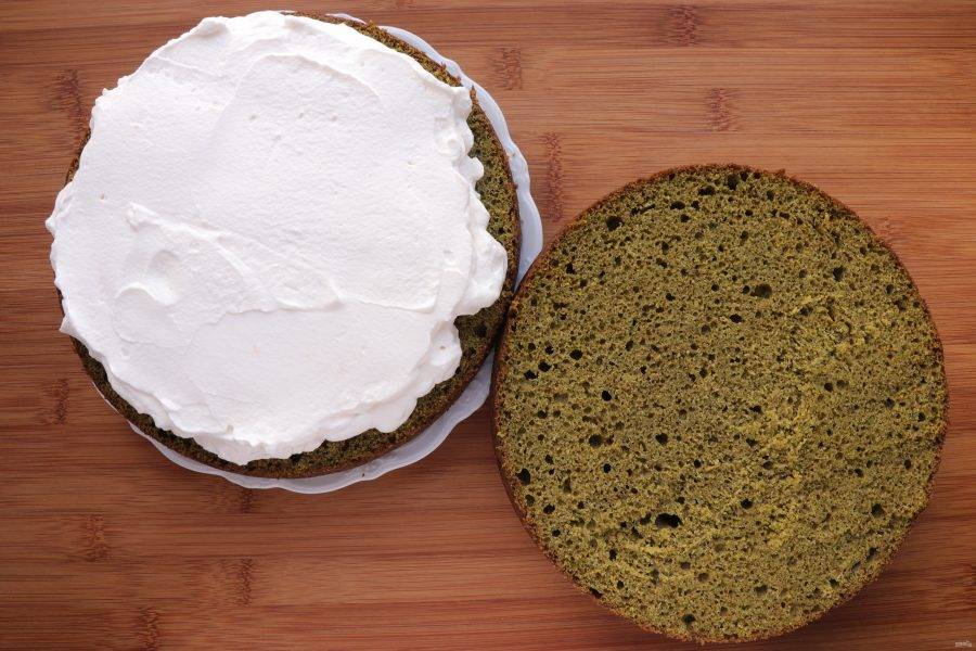 Остывший бисквит разрежьте вдоль на два коржа. Нижнюю часть смажьте сливочным кремом, оставьте несколько ложек крема для украшения верхнего коржа.
