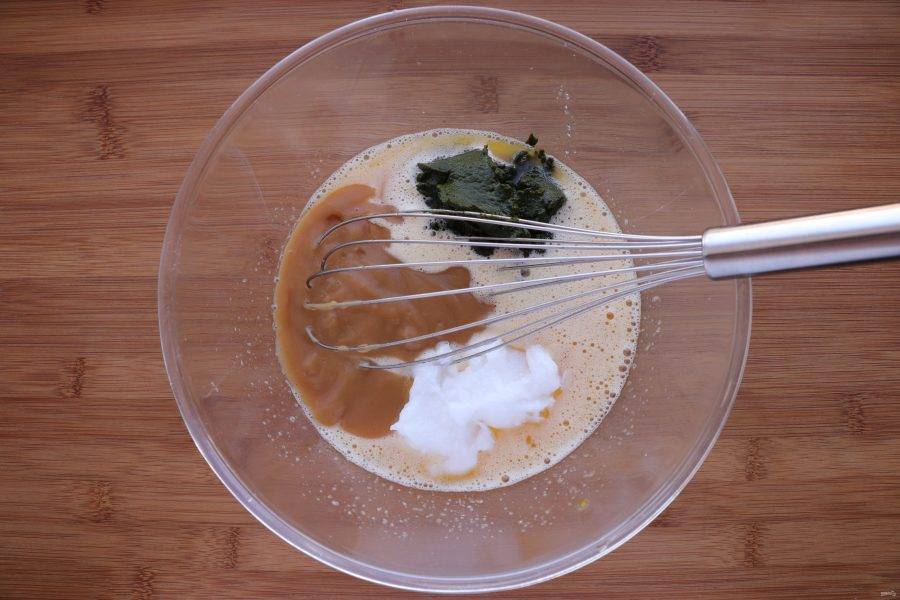 Добавьте яблочное пюре, я использовала пюре для детского питания, растительное масло, ванильный экстракт и измельченный шпинат. Перемешайте.