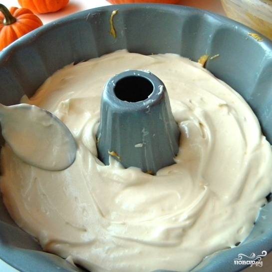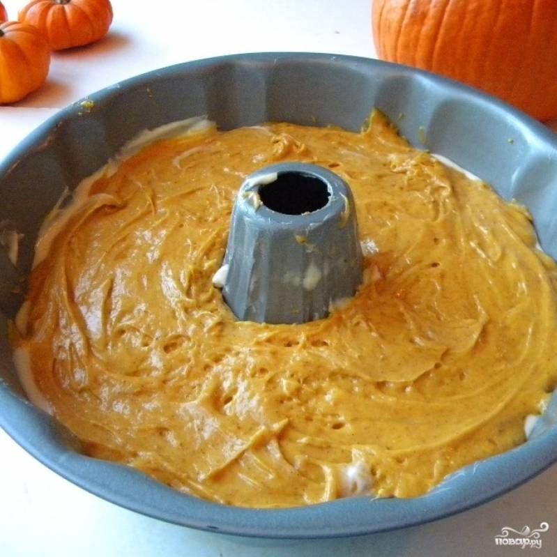 Затем выливаем вторую часть тыквенного теста, разравниваем.