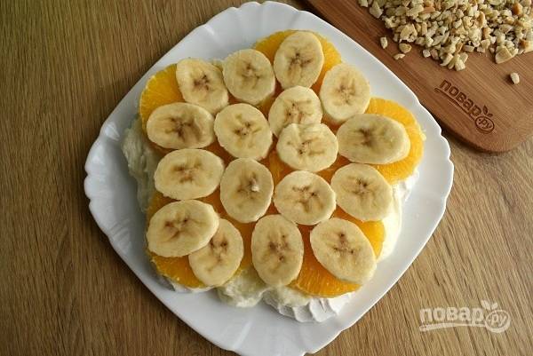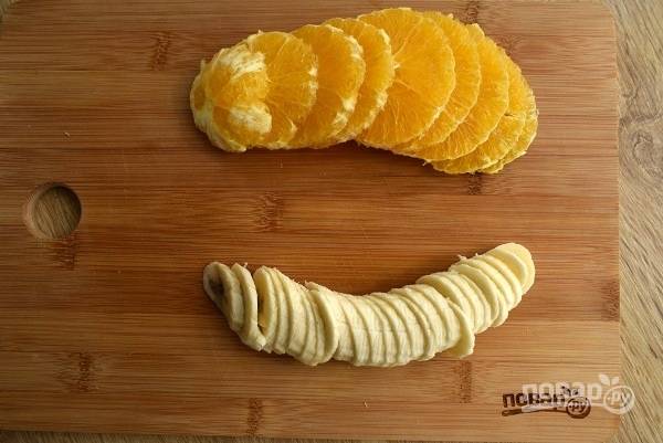 Апельсин и банан очистите, нарежьте тонкими ломтиками.