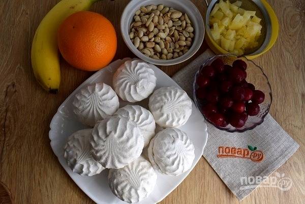 Подготовьте необходимые продукты. Вишню разморозьте и откиньте на сито. Кусочки ананаса откиньте на сито, чтобы стек лишний сок.
