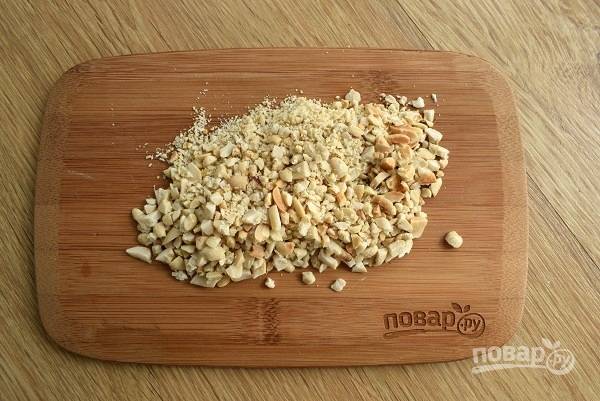 Орехи обжарьте на сухой сковороде до румяности, остудите, измельчите с помощью скалки или ножа.