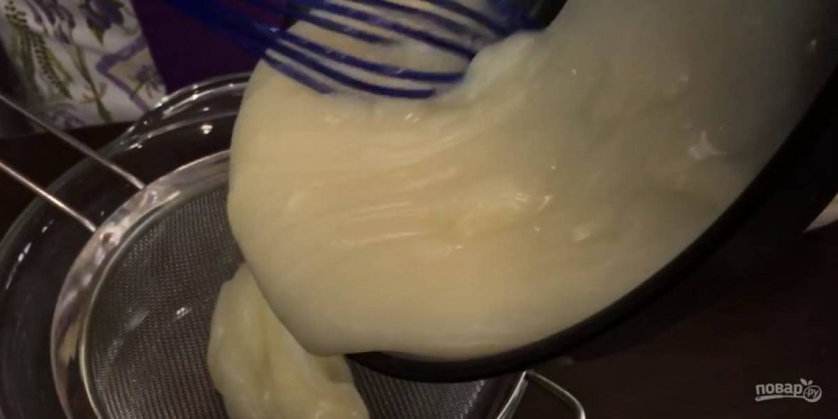 8. Снимите крем с огня и, если в нем есть комочки крахмала, сразу протрите через сито. Остудите крем. Мягкое сливочное масло взбейте миксером в течение 2-3 минут до белого цвета.
