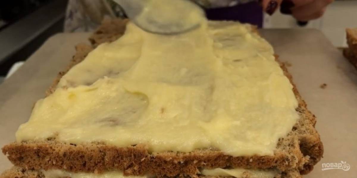 9. В три приема введите остывший заварной крем к маслу, каждый раз хорошо взбивая массу миксером. Уберите крем в холодильник на 1 час. Разрежьте остывший бисквит на две половины, после чего каждый корж разрежьте на три тонких коржа.