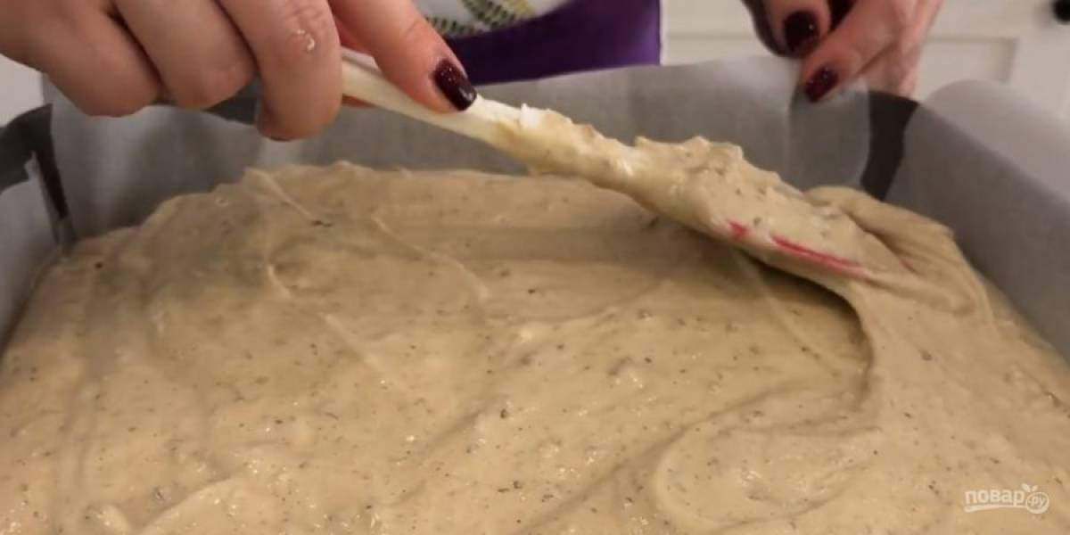 5. Противень размером 29х26 см выстелите пергаментом, равномерно выложите на него тесто. Выпекайте бисквит в разогретой до 180 градусов духовке 30 минут. Готовность проверьте деревянной палочкой.