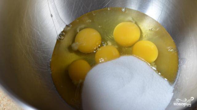 1. Бисквит нужно испечь заранее, лучше всего дать ему постоять ночь. Для его приготовления в глубокую мисочку вбейте яйца, добавьте сахар и щепотку соли.