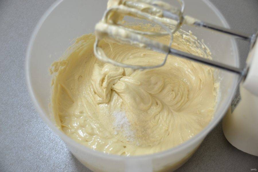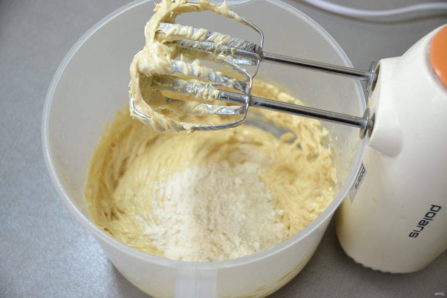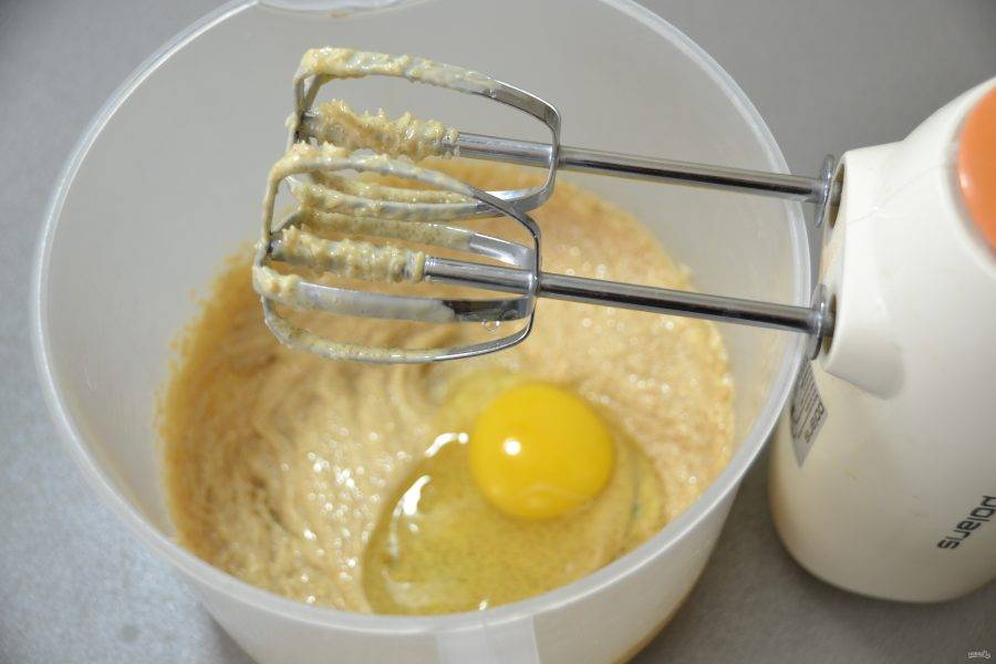 Взбейте. Затем по одному введите яйца, продолжая взбивать.