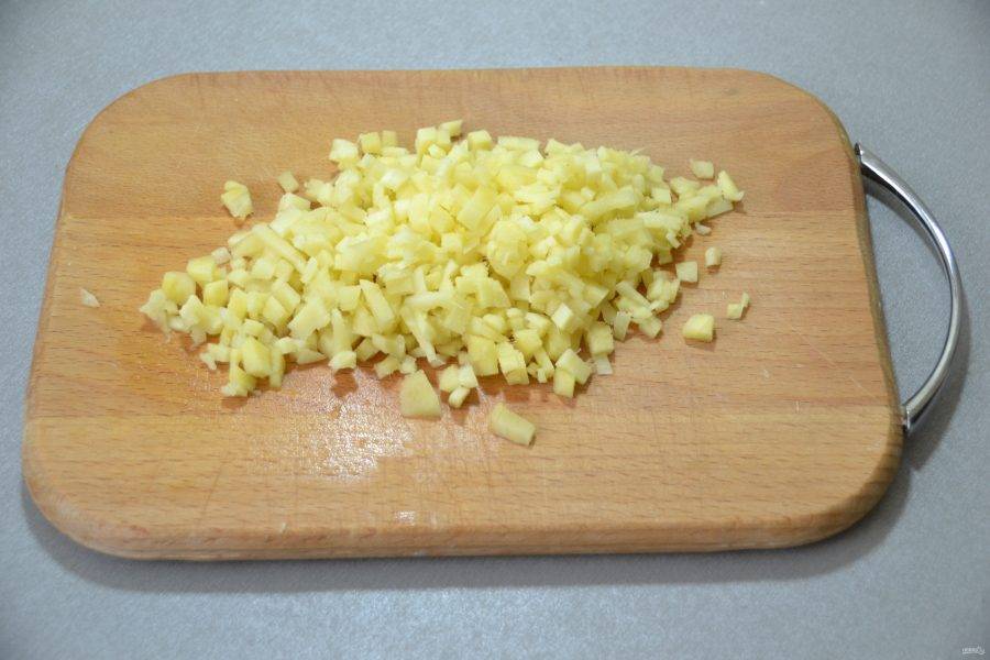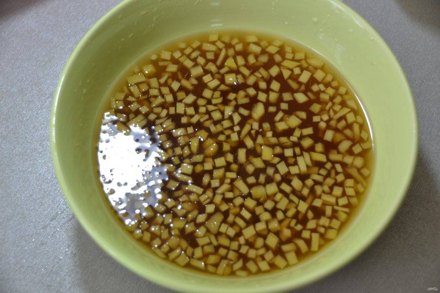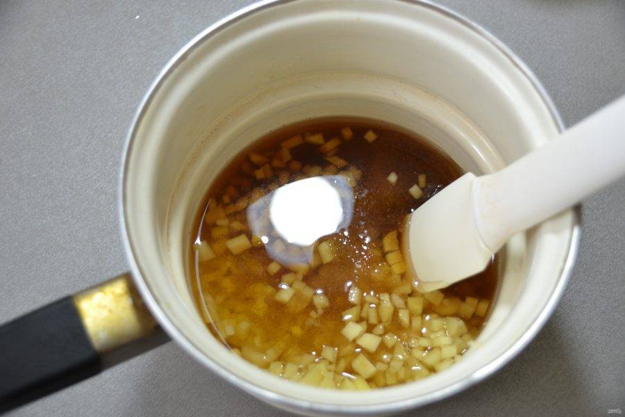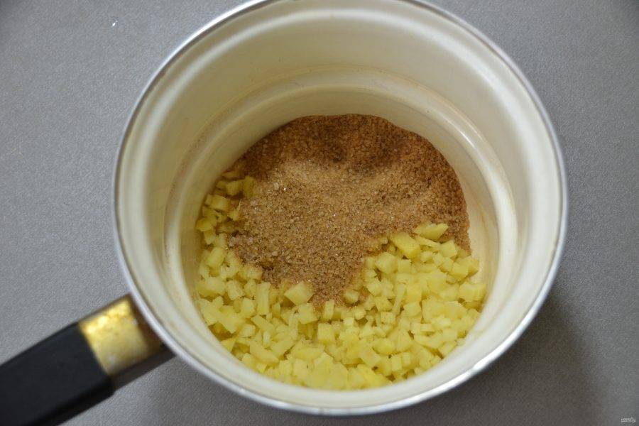 Выложите имбирь в кастрюлю, добавьте половину коричневого сахара.