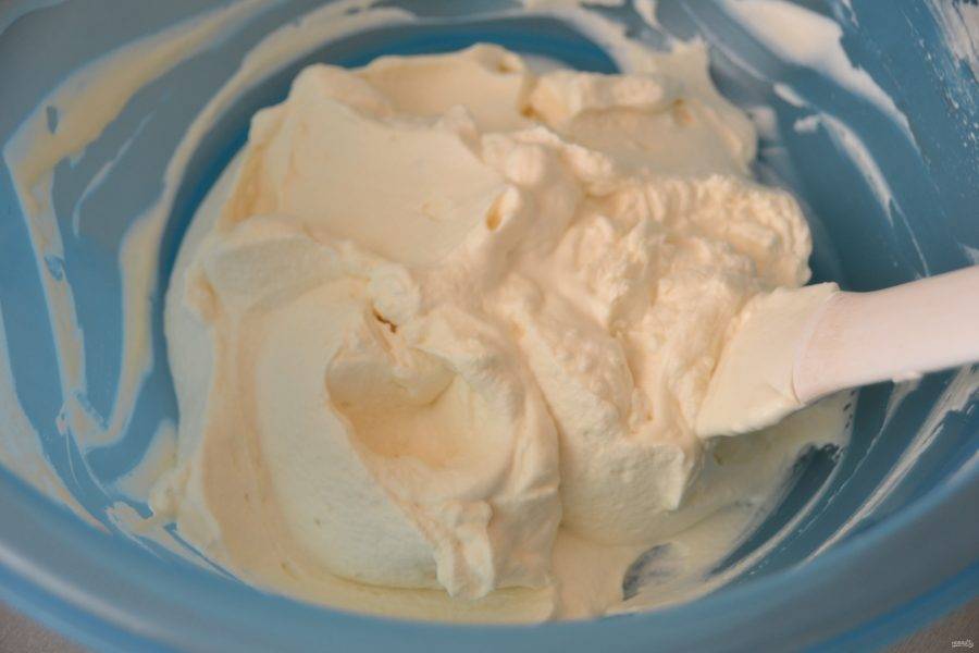 Взбейте до пышности сливки с пакетиком ванильного сахара и двумя столовыми ложками сахарной пудры.