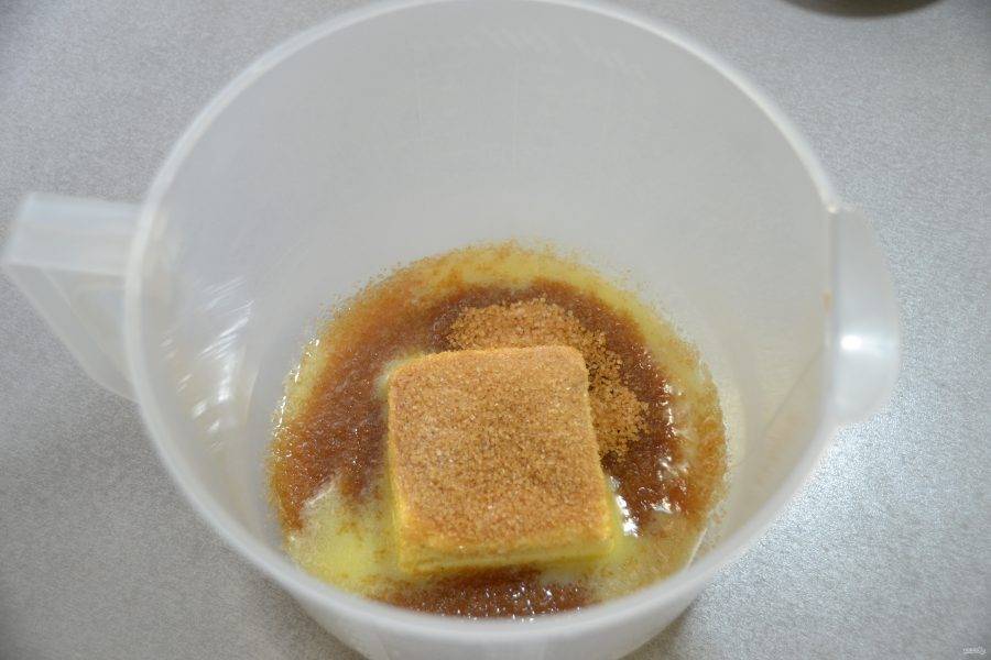 В емкость для взбивания выложите размягченное сливочное масло и остатки коричневого сахара.