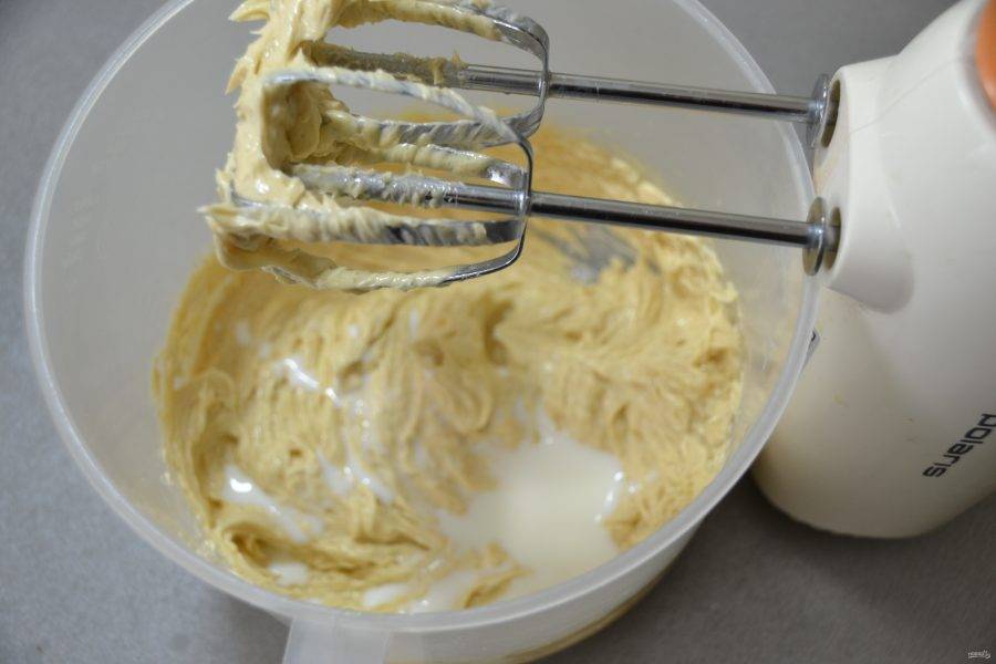 После чего, вводите по одной столовой ложке попеременно сначала молоко.