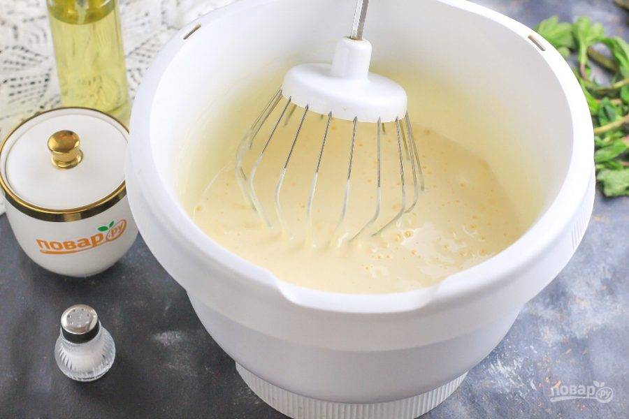 Вбейте куриные яйца в чашу миксера или кухонного комбайна, добавьте сахар, соль и взбейте в пышную пену 3-4 минуты.