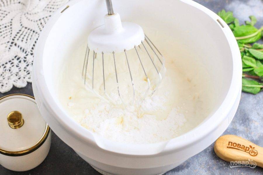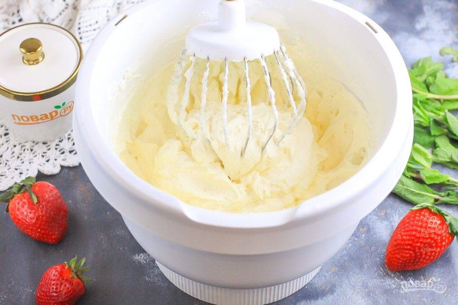 Для создания крема сливки обязательно охладите, а сливочное масло наоборот — прогрейте при комнатной температуре за час до начала взбивания. Взбейте сливки в течение 3-4 минуты до густоты и всыпьте сахарную пудру. Взбейте еще раз 1-2 минуты.