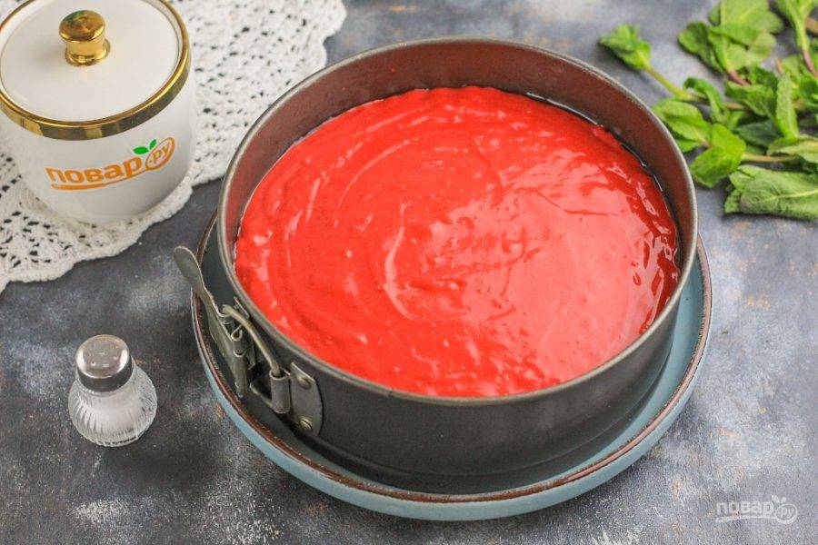 Сбрызните форму растительным маслом и выложите в нее красочное красное тесто. Разогрейте духовку до 160-180 градусов.