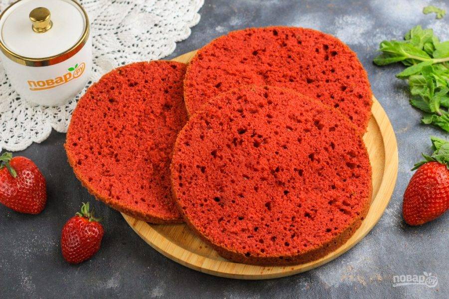 Испеките бисквит на среднем ярусе духовки примерно 45-50 минут. Обязательно проверяйте его на готовность, протыкая серединку бисквита деревянной шпажкой — она должна выйти сухой. После выпекания переверните форму с бисквитом на бок и остудите. Затем обверните остывший бисквит пищевой пленкой и отправьте в морозильную камеру минимум на 2-3 часа, а лучше — на ночь. За час до приготовления торта извлеките бисквит и прогрейте при комнатной температуре.