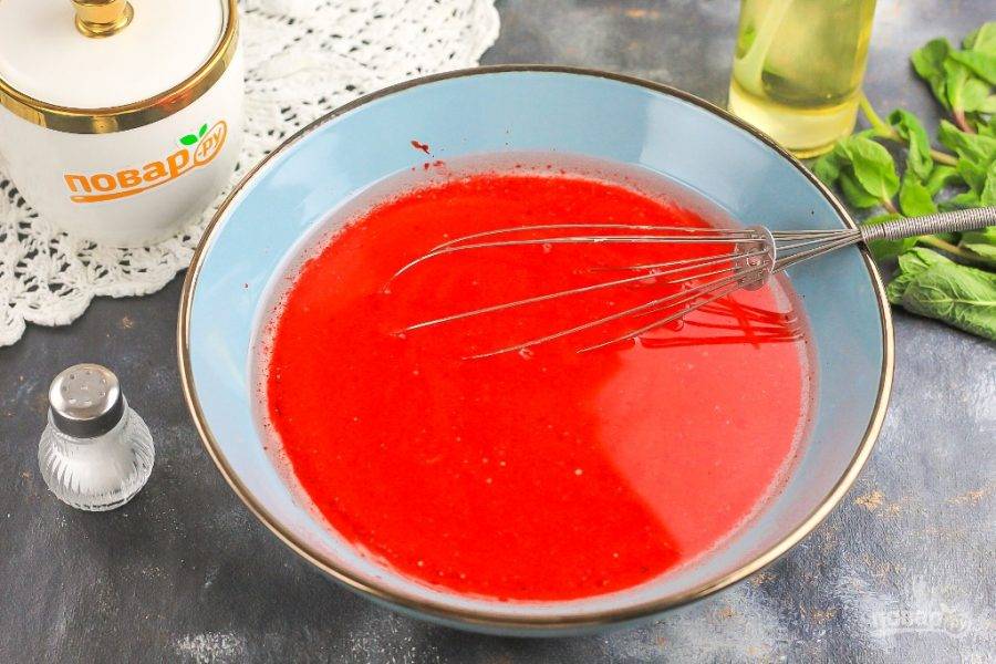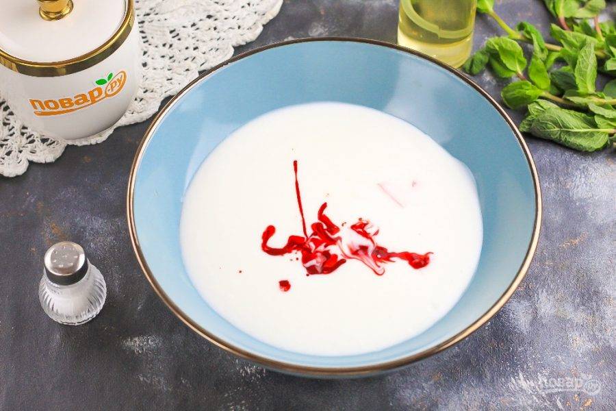 В глубокую миску или пиалу вылейте кефир любой жирности и добавьте в него красный краситель. Лучше всего использовать гелевый краситель, так как он не выгорает, когда тесто выпекается в духовке. Тщательно перемешайте.