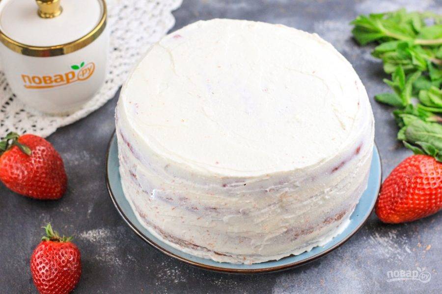 Соберите весь торт и обмажьте его оставшимся кремом. Отправьте в холодильник на 2-3 часа для пропитывания.