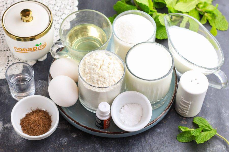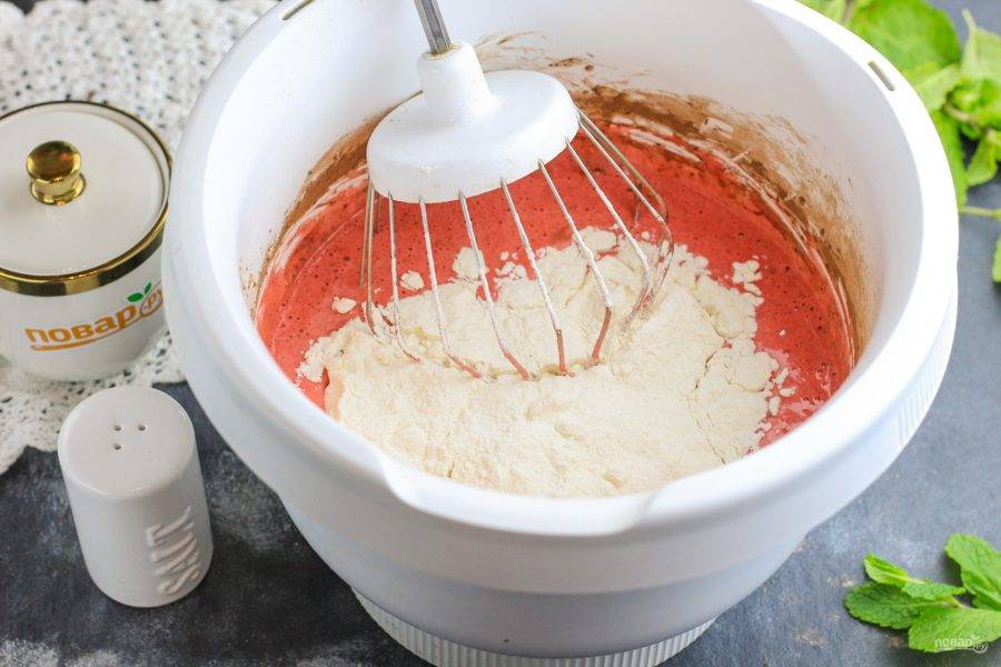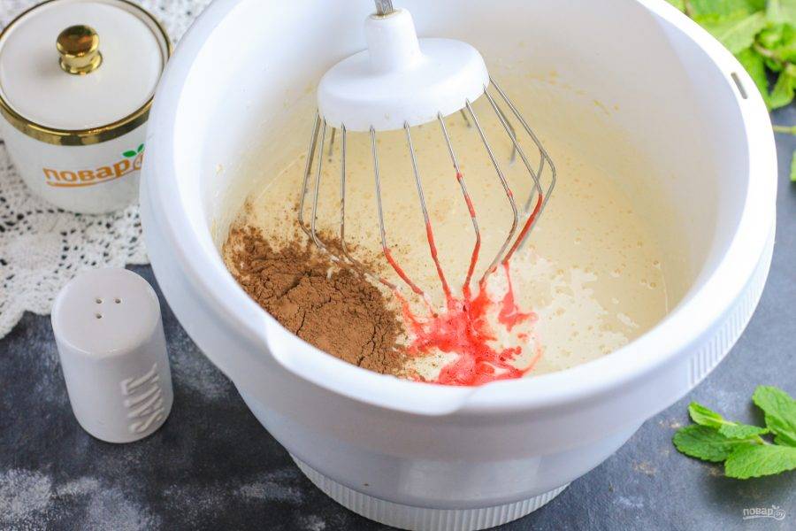 Влейте во взбитую массу красочный кефир с маслом и всыпьте какао. Аккуратно все перемешайте.