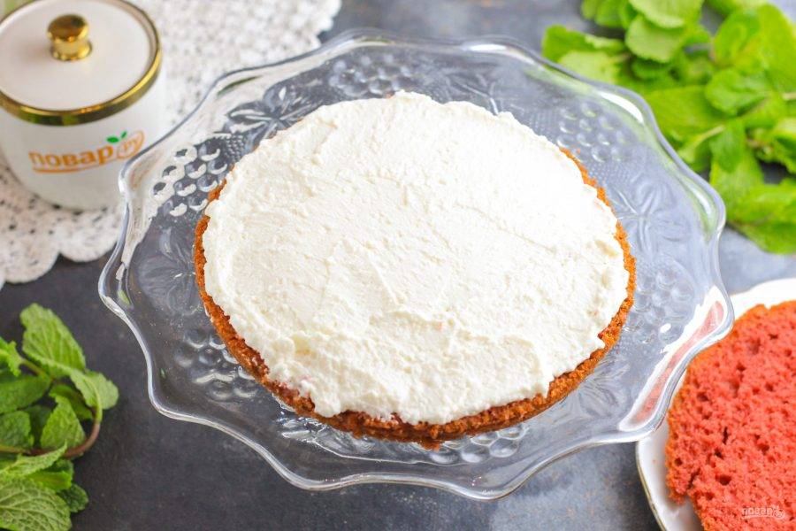 Выложите нижний корж на тарелку или блюдо, нанесите пятую часть крема и равномерно распределите.