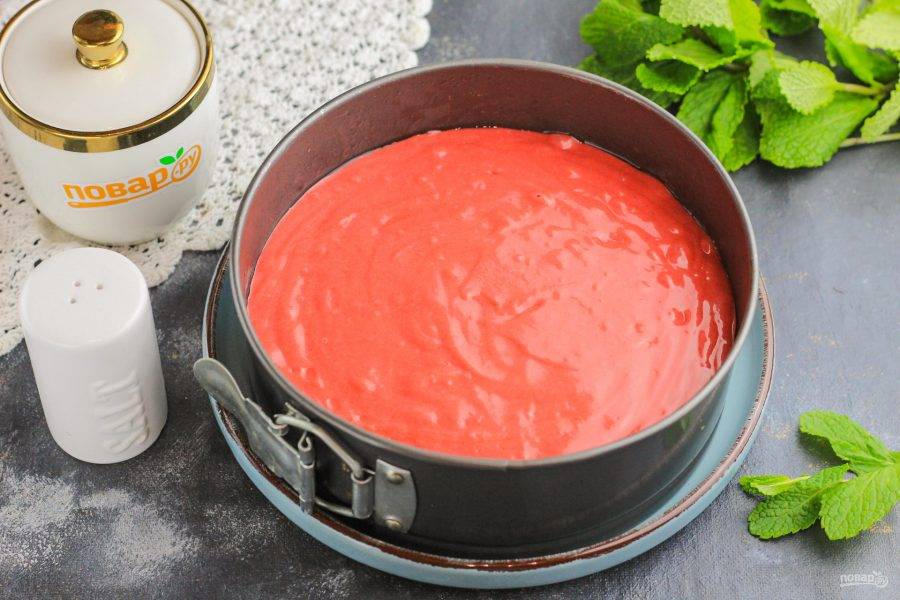 Разогрейте духовку до 160 градусов. Смажьте форму растительным маслом и вылейте в нее бисквитное тесто. Отправьте его в духовку на средний или нижний уровень, но не на дно духовки!