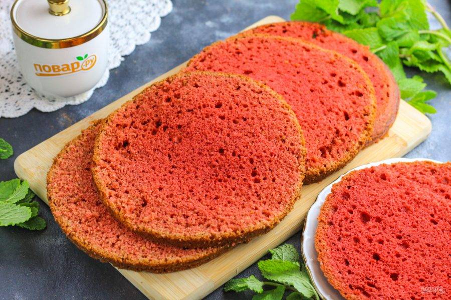 Испеките бисквит примерно 40-50 минут и обязательно проверьте его серединку деревянной шпажкой, она должна выходить из бисквита сухой. Не переживайте о том, что поверхность бисквита стала коричневой — это срежется. Остудите бисквит, заверните его в пищевую пленку и охладите в холодильнике минимум 4-5 часов, а лучше — ночь!