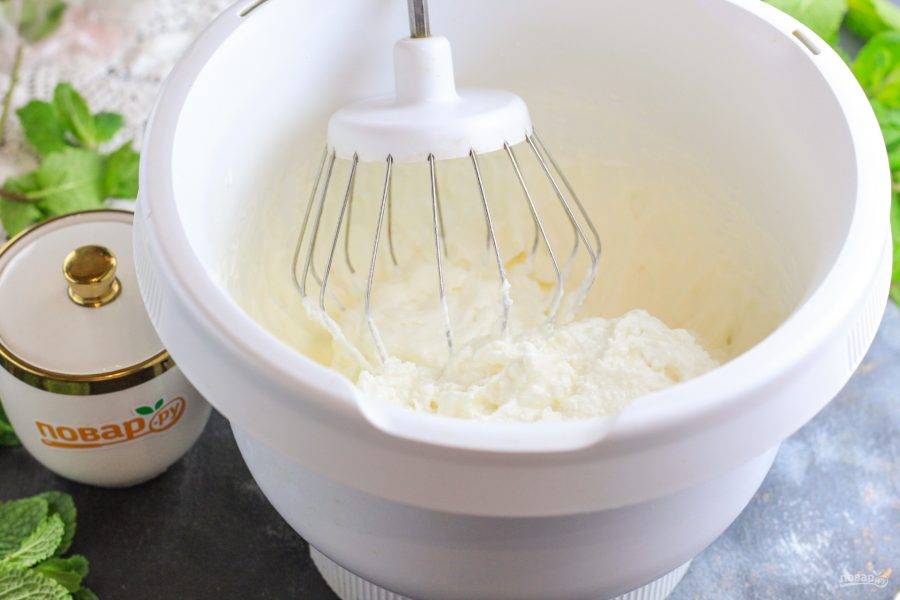 Взбейте охлажденные сливки с сахарной пудрой и загустителем для сливок примерно 4-5 минут. Затем добавьте творожный сыр и снова взбейте 1-2 минуты.