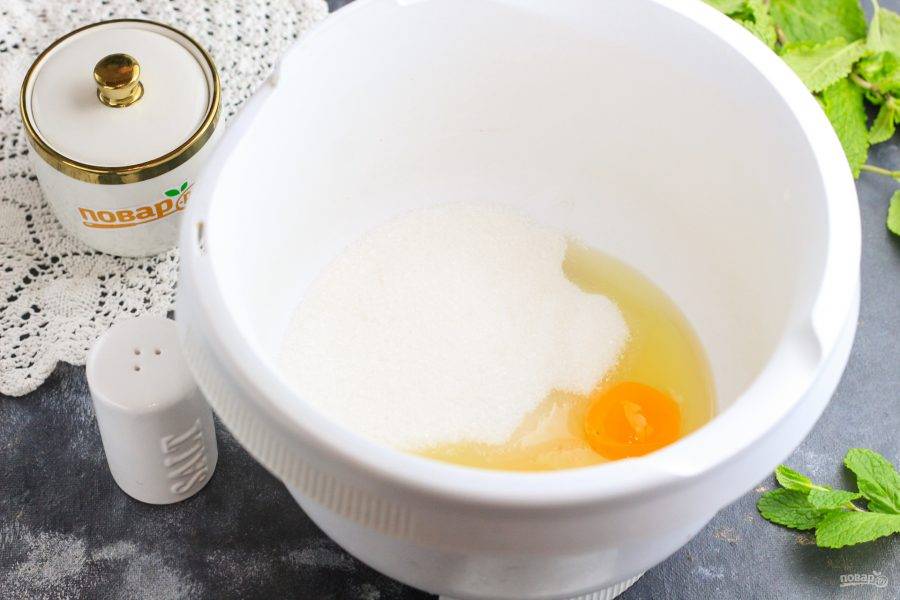 Вбейте куриные яйца в чашу кухонного комбайна или миксера, всыпьте сахар и соль. Взбейте примерно 3-4 минуты на высокой скорости техники.