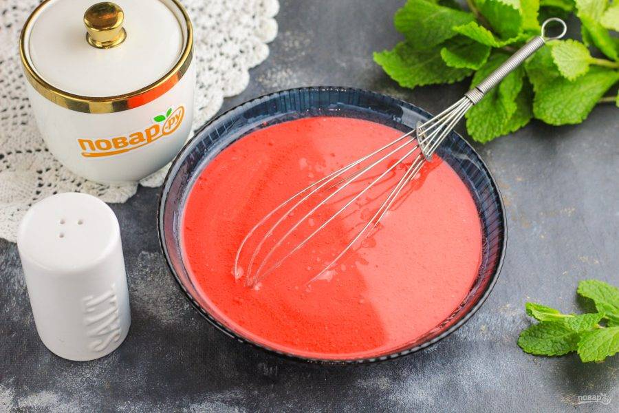 В пиалу или глубокую емкость влейте кефир любой жирности, растительное масло и добавьте красный краситель. Лучше всего использовать гелевый краситель, он не выгорает при выпекании. Влейте уксус или лимонный сок, тогда красный цвет бисквита не потускнеет. Тщательно перемешайте.