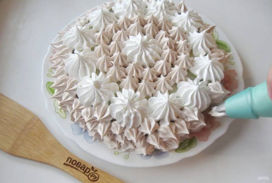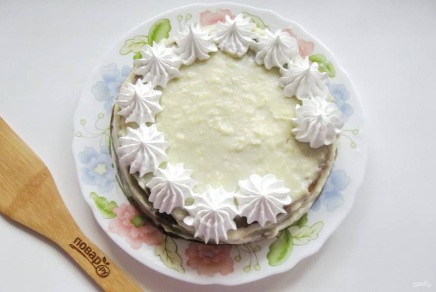 Украсьте торт по вкусу. У меня это взбитые белки с сахаром на водяной бане.