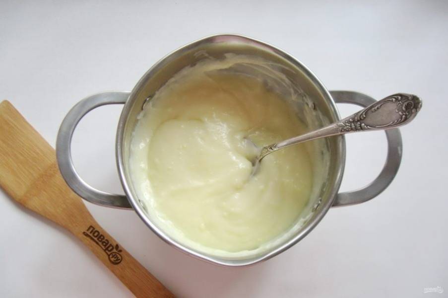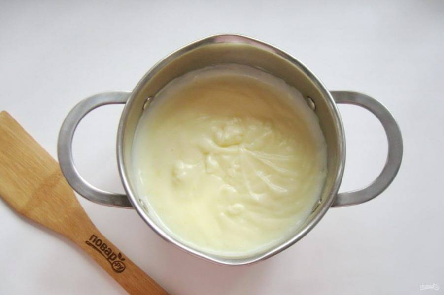 Сварите крем. В кастрюлю налейте молоко и поставьте на плиту. В мисочке смешайте 2 желтка, 100 грамм сахара и 3 столовые ложки крахмала. Когда молоко начнет закипать, добавьте эту смесь. Постоянно перемешивая, доведите крем до загустения.