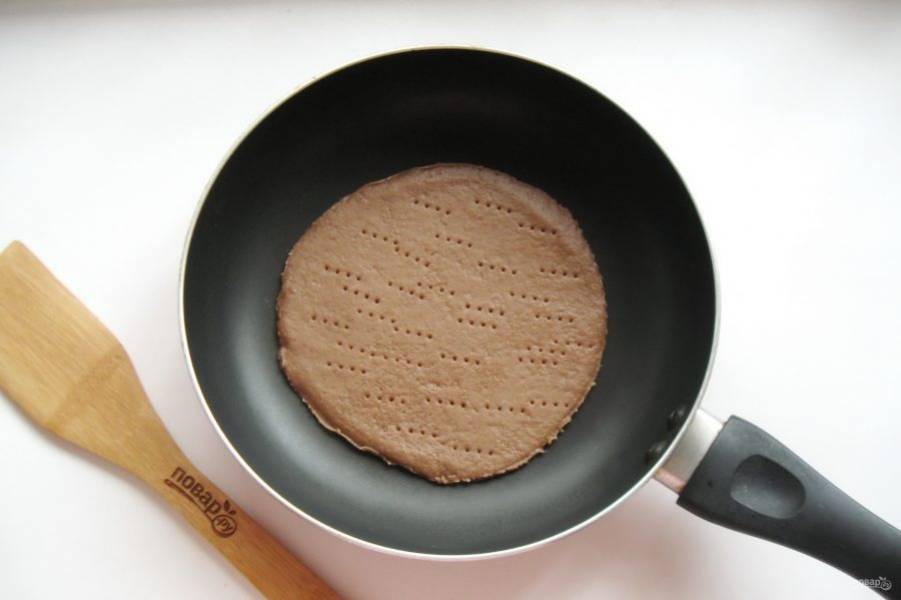Разделите тесто на пять частей. Каждую часть раскатайте в тонкий пласт и выложите в сковороду. Наколите вилкой.